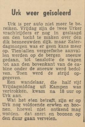 Inmiddels verzamelden vrachtwagens met kolen, aardappelen en andere levensmiddelen zich in Kampen om de tocht naar Urk over de dijk te wagen. Een ploeg van zestig dijkwerkers probeerde met man en macht de dijk berijdbaar te maken. ‘Ik heb al vier dagen pannenkoeken gegeten en ik zou onderhand wel eens een aardappel willen zien’, klaagde een Urker in de Volkskrant.[4]