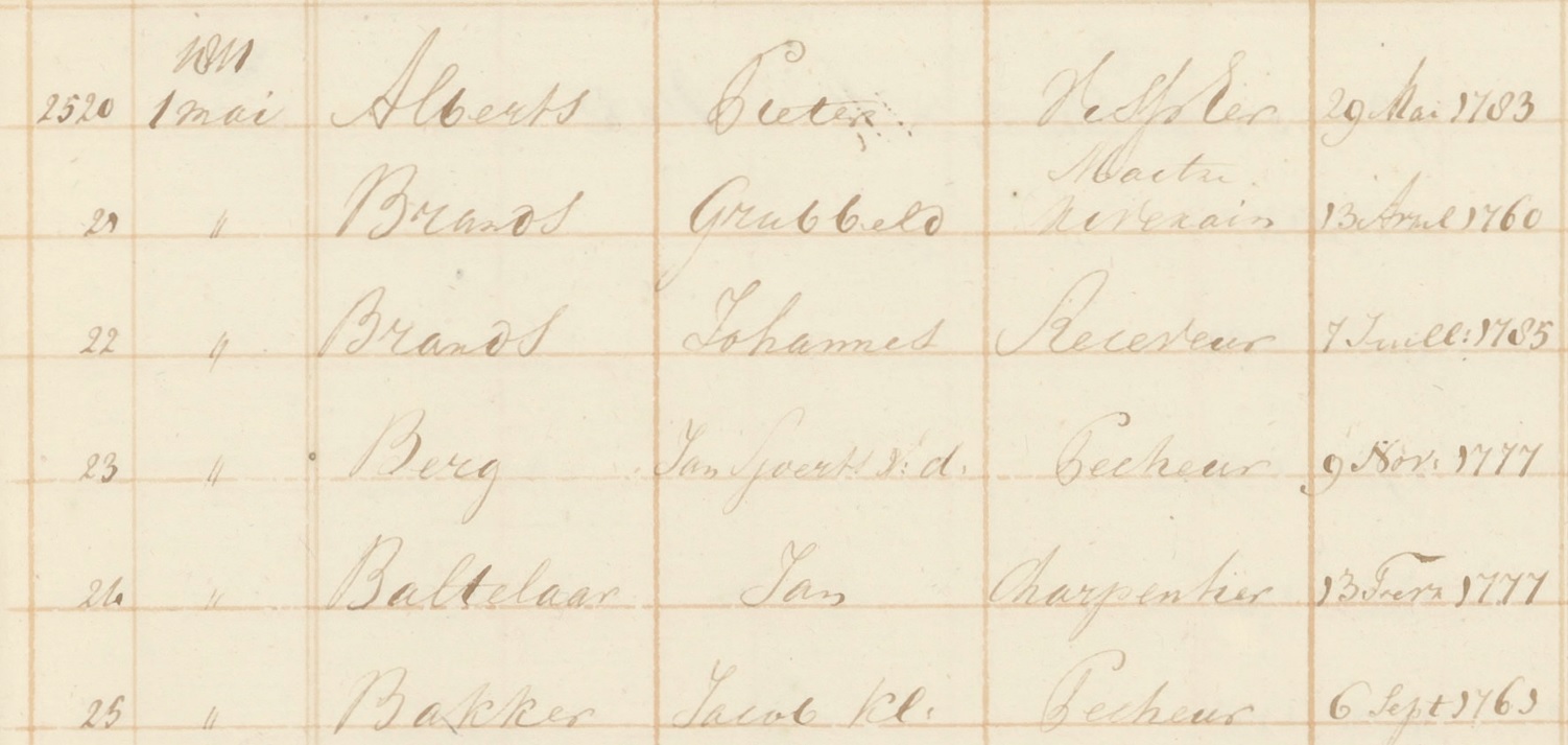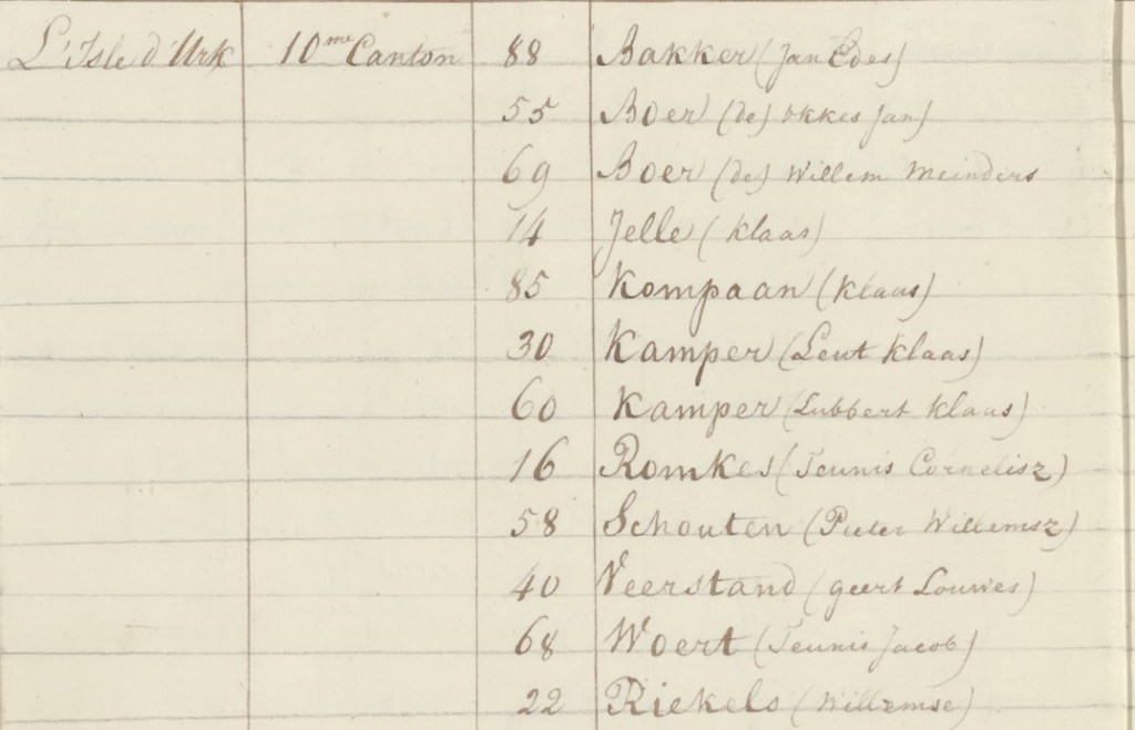 Een fragmentweergave van de lijst met Urker mannen uit 1811 – Noord Hollands Archief