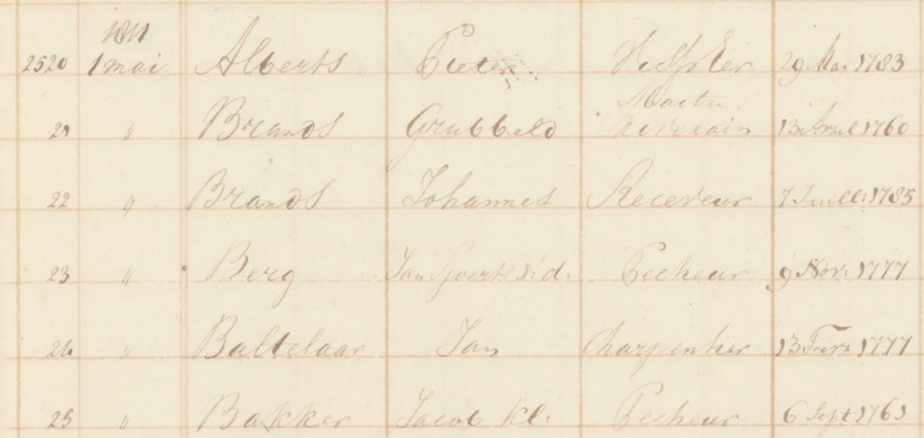 Wel is er een lijst met alle volwassen mannelijke inwoners van Urk, met hun beroep. Op 1 mei 1811 werden ze in het register ingeschreven. De lijst bevatte 135 namen van Urker mannen, waarvan er 122 pรชcheur (visser) waren.  Daarnaast woonden er een burgemeester, dominee, chirurgijn, schoolmeester, handelaar, belastingontvanger, opzichter van de maritieme werken, twee timmermannen en drie bakkers.