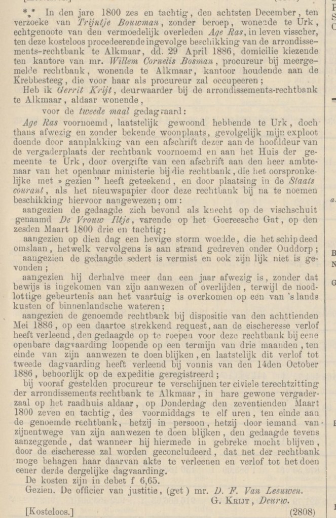 Hans Saarloos attendeerde me op de eerste oproep aan Age Ras, een advertentie in de Alkmaarse Courant van april 1886.[4] In de Staatscouranten van juli en december zijn de volledige dagvaardingen opgenomen. Deze tonen aan dat de algemene gedachte was dat Age bij de ramp van 1883 was omgekomen: ‘aangezien de gedaagde zich bevond als knecht op de vischschuit genaamd De Vrouw Iltje, varende op het Goereesche Gat, op den zesden Maart 1800 drie en tachtig; aangezien op dien dag een hevige storm woelde, die het schip deed omslaan, hetwelk vervolgens is aan strand gedreven onder Ouddorp; aangezien de gedaagde sedert is vermist en ook zijn lijk niet is gevonden.’.[5]