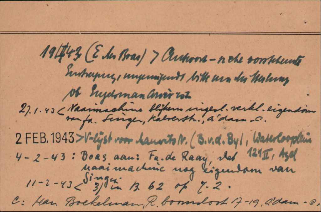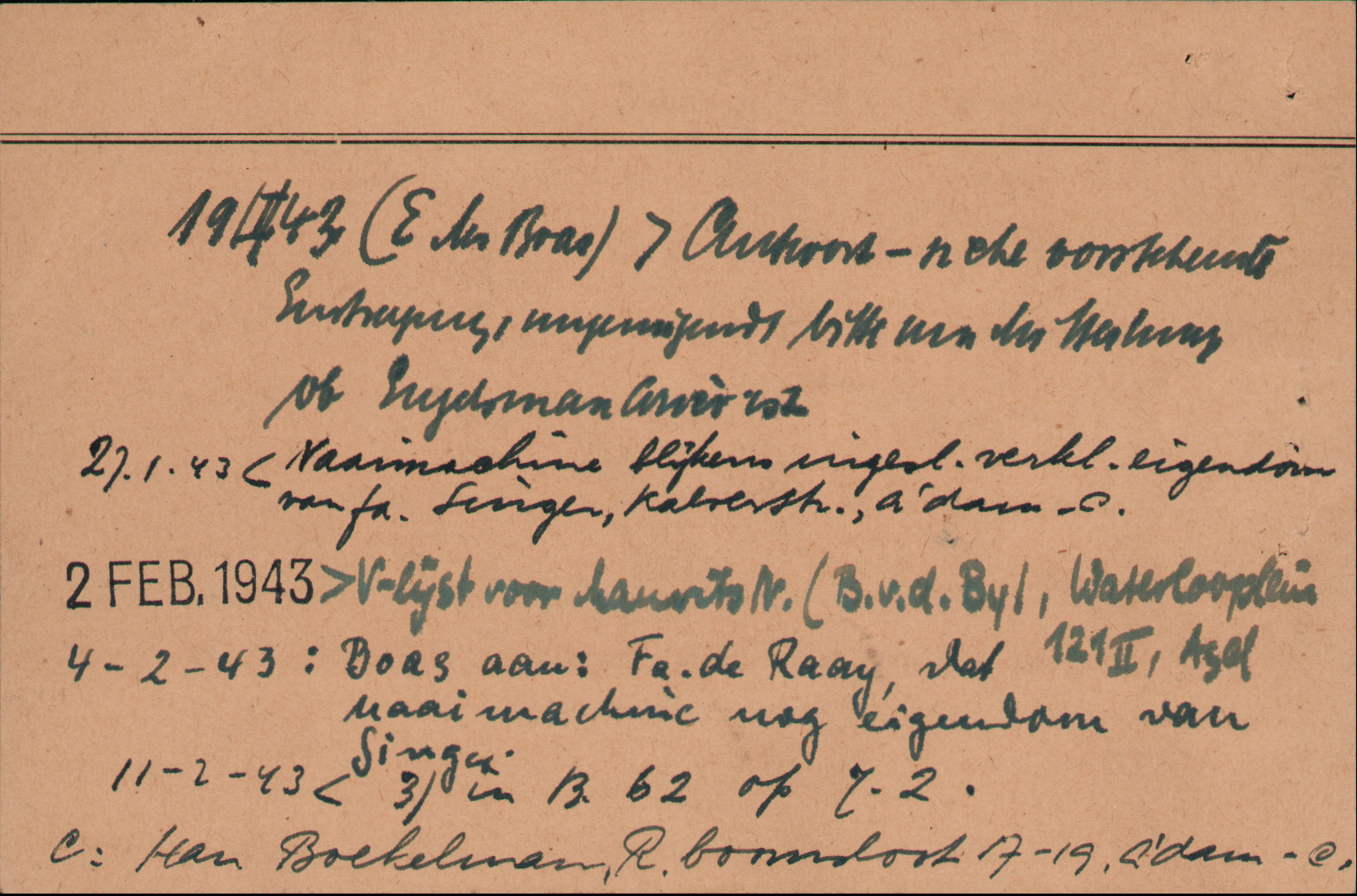 In 1943 moet vader Joseph zich melden voor kamp Vught. Via zijn registratiekaart ontstaat er een lange discussie over zijn naaimachine. Joseph staat er op dat hij zijn naaimachine mee mag nemen naar Vught. Uiteindelijk blijkt de machine nog het eigendom van de fa. Singer te zijn en blijft de naaimachine in Amsterdam.
